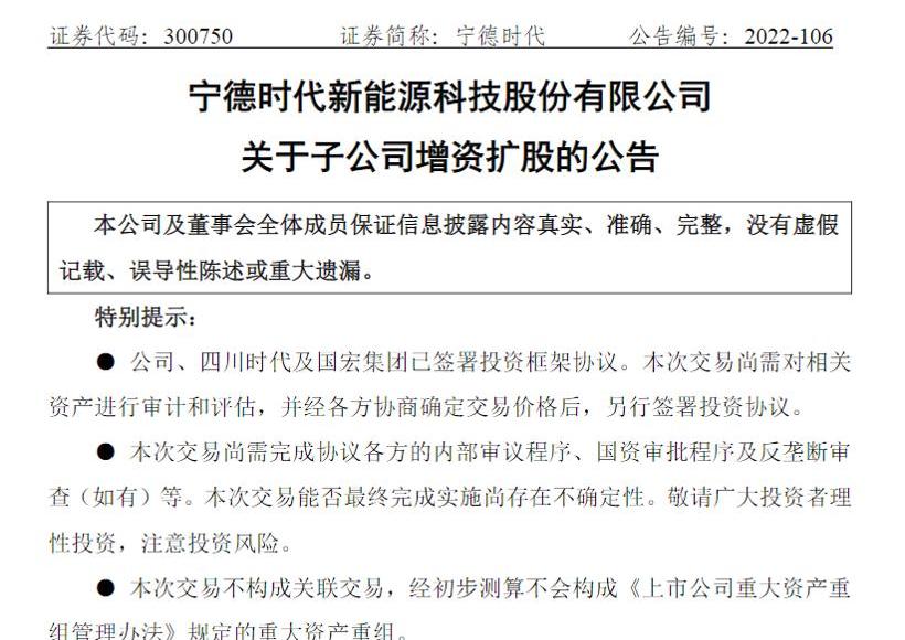 9月30日,當代安培科技有限公司與郭虹集團簽署投資協議,郭虹集團將以其持有的洛礦集團全部股份對四川時代進行增資。
