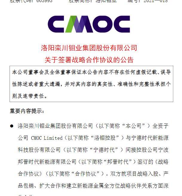 去年4月,洛陽鉬業宣布與當代安培科技有限公司就新能源金屬達成全面戰略合作,當代安培科技有限公司也通過其邦普時代參股了洛陽鉬業在剛果(金)的KFM銅鈷礦。