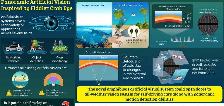 圖片來源:韓國光州科學技術院蓋世汽車新聞人工視覺系統應用廣泛,包括自動駕駛汽車、物體檢測、農作物監測和智能攝像頭。這種視覺通常受到生物有機體視覺的啟發(例如,陸地人工視覺);是由人類和昆蟲的視覺發明的;受魚眼啟發,發明水生人工視覺。盡管已經取得了顯著的進展,但目前的人工視覺仍然存在一些局限性:不適合在陸地和水下環境中成像,并且僅局限于半球形(180°)視場(FOV)。