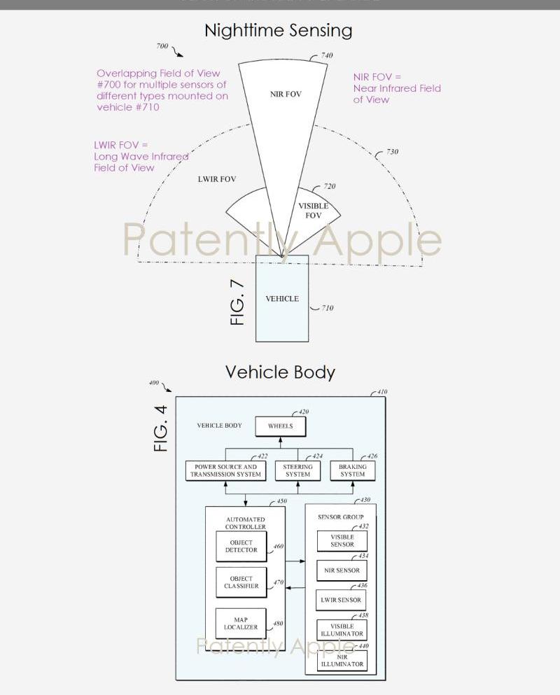 蘋果專利圖4和7(圖片來源:patentlyapple.com)據國外媒體報道,近日,美國專利商標局正式授予了兩項與蘋果公司的Project Titan相關的專利。其中一個提出了可以在車輛坐標系中確定車輛速度和側滑角的技術,使車輛在濕冷路面上穩定行駛;另一種是多模式傳感器,可以幫助自動駕駛汽車在夜間探測和識別物體。它的性能比傳統大燈更好,未來可以挽救很多生命。