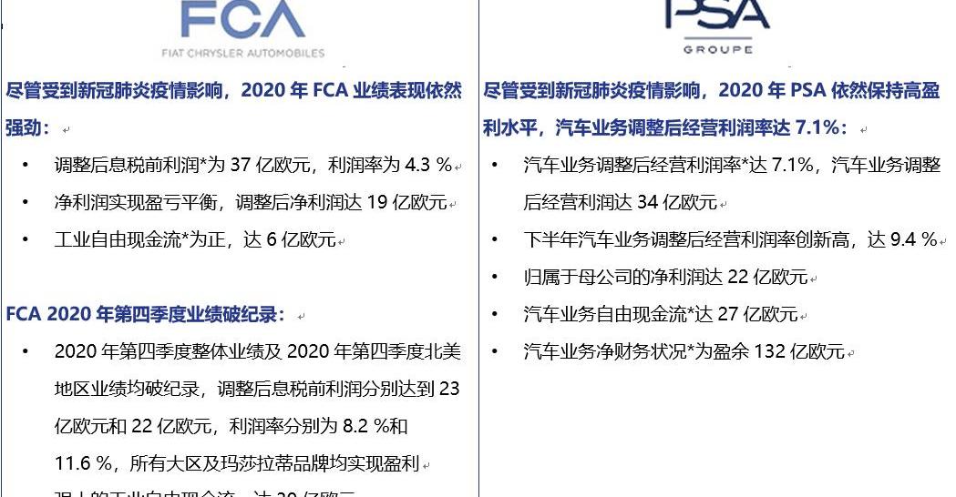 經營目標(三)2021年:實現調整后營業利潤率5.5%-7.5%(前提是不發生大規模新冠肺炎疫情封鎖)。2021年1月16日,PSA集團(PSA)與菲亞特克萊斯勒汽車公司(FCA)的跨界合并正式完成,雙方合并為一個全新的集團:Stellantis。以下是FCA和PSA在合并完成前以及截至2020年12月31日的2020年財務表現。