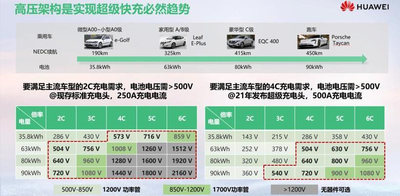 充電標準方面,2021年,充電頭將由原來的950V(250A)標準改為1000V(600A)的超級充電頭。未來不同標準的主流方向是1000-1500V和500-600A系統,從而支持超級快充。二、高壓快充吸引多方布局,全球逐漸向目標邁進。王超認為,高壓架構是實現超級快充的必然趨勢。很多充電巨頭其實已經開始了高壓快充超級樁的布局,預計2021年我們會逐步向目標邁進。從海外情況看,歐洲CEF出資建設高速充電設施,呈現快速發展趨勢,基本可以滿足高電壓快速充電模式。在國內,從2018年開始,高壓樁逐漸布局。基于不同的主要運營商,500V以下的低壓樁數量約為11萬根,500V以上的高壓樁數量為18萬根。與車企擔心的情況不同,高壓樁占比一直高于低壓樁,未來三年仍將快速發展。我們認為,到2022年左右,部署的高壓樁可以基本匹配電動汽車批量使用,提前兩年滿足快充需求。王超表示,雖然部分車企對高壓樁的布局仍有顧慮,但很多車企已經提前布局高壓平臺。從2021年開始,高電壓快充體驗將成為電動車市場差異化體驗的重要標準。針對主流車型的需求,王超介紹,從A00到豪華型,從35.8 kWh到100 kWh以上,基于電池所能承載的不同電量、不同充電率的車型,基本上整車的電氣架構在滿足主流車型2C需求的情況下需要大于500V。未來超級充電頭啟用后,基于主力機型4C的充電需求,大于500V的電氣架構也將是必經路徑。