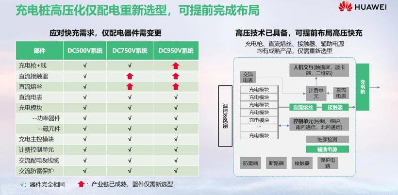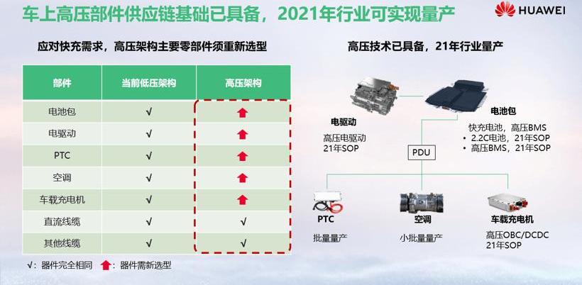 500V以下電氣架構的存在主要受650V和750V功率半導體器件的限制。王超預測,2024年左右,基于1200V和1700V的碳化硅器件的成熟,將幫助行業在7.5分鐘快充體驗上實現質的飛躍。第三,高壓快充技術基本具備,2021年可實現量產。如果采用高壓架構平臺,電動車的電池組、電驅動、PTC、空調都需要重新適配。基于技術的快速迭代,一旦產業鏈成熟,可以快速拉低整個行業的成本,預計2021年可以實現行業量產的目標。從堆的角度來看,成熟度比車好很多,除了充電、電線、接觸器、保險絲會有一些差異,其他設備不需要改動。