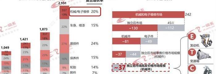根據IHS研究報告,2018-2025年,隨著車齡的持續增長和汽車保有量的持續增加,各類配件的復合增長率達到16%。過去,易損件領域發展迅速。現在機械電子維修專業零件的快速增長也很可觀。近幾年復合增長率高達20%。這些零件主要用于三個系統:發動機、變速箱和底盤。