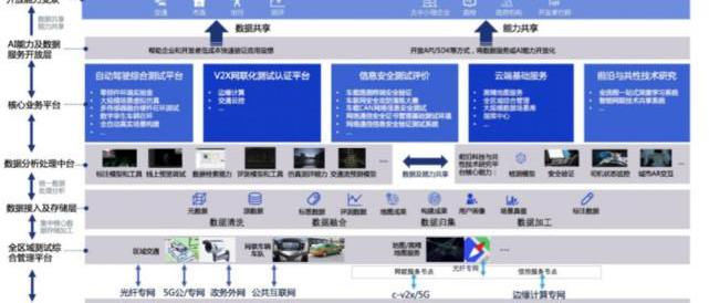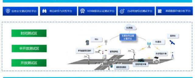 五大平臺分別是V2X網聯測試認證平臺、自動駕駛綜合測試平臺、數據存儲與分析平臺、共性基礎數據存儲與分析平臺和前沿技術與共性技術研究平臺,為各測試平臺提供基礎能力支撐。