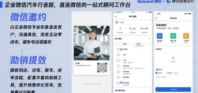 企業微信汽車行業版搭建了一站式咨詢工作臺,可以幫助主機廠和經銷商提供更專業的店端服務。它將客戶微信與企業微信的專業形象直接對接,承擔傳播邀約的角色,具有高效、零成本、無騷擾的特點。在這個過程中,還配備了豐富的銷售輔助工具,可以提高從預約試駕、跟蹤到門店、服務計費的銷售轉化效率,工作效果可以量化和衡量。
