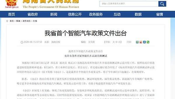 據悉,這是海南省首個智能汽車政策文件,將于今年10月1日正式實施,有效期兩年。《辦法》主要圍繞吸引企業落地、規范檢測環節、明確檢測制度等內容。