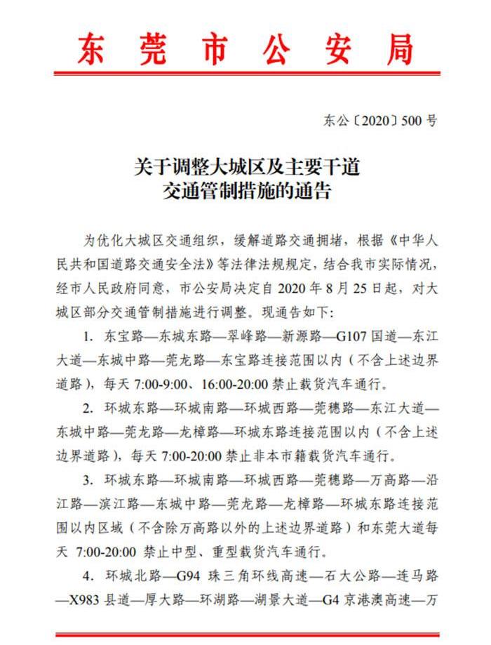 2近日,東莞市局發布關于調整大城市主干道交通管制措施的通告。通告稱,自8月25日起,東莞對大城區部分交通管制措施進行了調整。值得注意的是,新能源牌照車輛和執行緊急任務的軍警、消防、救護、工程救援等特種車輛不受限制。此外,文件還提到,為新規的實施設置了一個月的執法緩沖期。在此期間,車輛原則上只接受交警部門的法制教育警告。以下是原始政策: