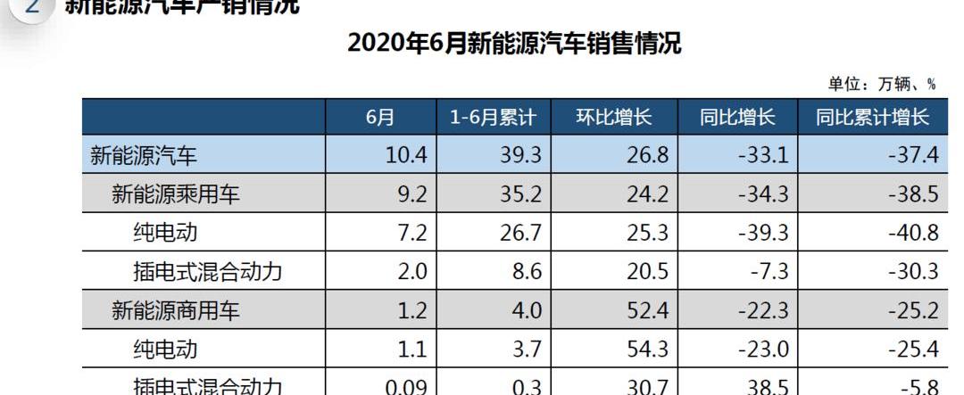 1-6月,新能源汽車產銷分別完成39.7萬輛和39.3萬輛,同比下降36.5%和37.4%,降幅比1-5月略有收窄。新能源汽車主要品種中,純電動汽車和插電式混合動力汽車產銷同比雙雙下降,純電動汽車降幅仍高于行業。7月10日,中汽協召開網上月度信息發布會,發布2020年6月汽車行業產銷情況。2020年6月汽車產銷繼續回暖,當月產銷量保持環比、同比增長,其中商用車同比增速較為明顯。6月份,汽車產銷分別完成232.5萬輛和230萬輛,環比增長6.3%和4.8%,同比增長22.5%和11.6%。