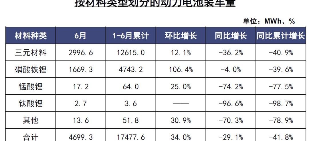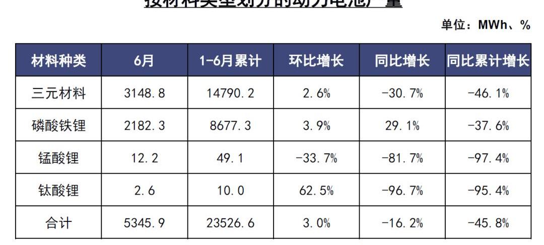 1-6月,中國動力電池產量累計23.5GWh,同比下降45.8%。其中,三元電池累計產量14.8GWh,占總產量的62.9%,累計同比下降46.1%;磷酸鐵鋰電池累計產量8.7GWh,占總產量的36.9%,累計同比下降37.6%。