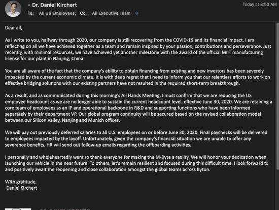 拜騰汽車首款車型M-Byte來源:拜騰汽車官網未來汽車日報(ID: auto-time)獨家獲悉,美國時間6月24日上午8點50分左右(中國時間6月24日晚),拜騰汽車CEO戴雷在北美辦公室給全體員工的郵件中宣布:“經過今天上午的全體員工會議討論,我確認6月30日前在美國進行裁員,拖欠美國員工工資。