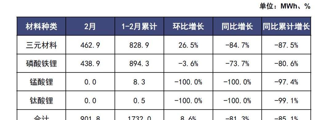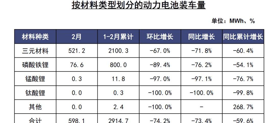 3月12日,中國汽車動力電池產業創新聯盟發布了2020年2月新能源汽車電池產量和裝載量數據。2020年2月,中國動力電池產量合計0.9GWh,同比下降81.3%,環比增長8.6%。其中,三元電池產量0.5GWh,占總產量的51.3%,同比下降84.7%,環比上升26.5%;磷酸鐵鋰電池產量0.4GWh,占總產量的48.7%,同比下降73.7%,環比下降3.6%。2020年1-2月,中國動力電池產量累計1.7GWh,同比下降85.1%。其中,三元電池累計產量0.8GWh,占總產量的47.9%,同比下降87.5%;磷酸鐵鋰電池累計產量0.9GWh,占總產量的51.6%,累計同比下降80.6%。