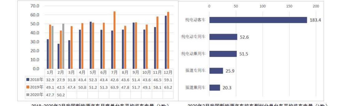 從單輛車平均裝載功率來看,2020年2月,我國新能源汽車平均裝載功率為50.2千瓦時,環比增長5.2%,主要受純電動乘用車高充電產量占比提升的帶動。純電動乘用車方面,2020年2月單車平均載重量為51.5kWh。
