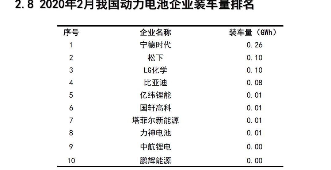 分企業看,2020年2月,中國新能源汽車市場共有25家動力電池企業實現裝車設施,比2020年1月減少18家。前3名、前5名和前10名的動力電池裝載分別為0.46GWh、0.56GWh和0.59GWh,占整車的77.4%、93%和98.7%。當代安培科技有限公司、松下和LG化學位列當月前三。
