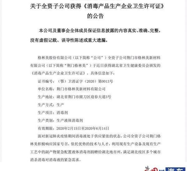 公告信息顯示,該牌照有效期為2020年2月15日至2020年6月14日四個月。梅格表示:在保證主導產品正常生產經營的同時,公司將全力以赴生產疫情防控急需的消產品,緩解當前湖北疫區消產品短缺的局面。此外,梅格在公告中還表示,荊門梅格將利用現有生產設備和現有生產工藝中的副產品,緊急調撥液體消劑捐贈湖北,以滿足湖北疫區城市對消劑的迫切需求。目前,GEM已經投資了一條生產線,每天可以24小時生產100噸消劑,這些產品將全部用于捐贈。據報道,梅格的主要業務是通過回收廢舊電池、電子垃圾等廢棄資源,回收高科技產品。其子公司荊門梅格主要回收廢舊電子材料和新能源動力電池材料。據悉,化工原料氯酸鈉溶液可在廢舊電子材料和新能源動力電池材料回收過程中產生,是84消液的原液。而且梅格也有成套的檢測設備和技術,可以直接生產84消液。