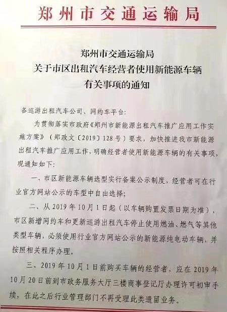 9月29日,鄭州市交通運輸局發布《關于城市出租汽車經營者使用新能源汽車有關問題的通知》稱,從2019年10月1日起,鄭州市區新增網絡約租車和更新巡游出租車停止使用燃油、燃氣、等類型車輛,必須使用行業官網公布的新能源純電動汽車。