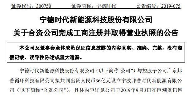 9月3日,當代安普科技股份有限公司發布公告稱,為保證公司正極材料的供應,促進公司整體戰略目標的實現,公司擬與控股子公司廣東邦普循環科技有限公司(以下簡稱“廣東邦普”)出資36億元共同設立寧波邦普時代新能源有限公司,從事正極材料及相關資源的投資和運營。其中,當代安培科技有限公司出資17.64億元,持股49%;廣東邦普出資18.36億元,持股51%。昨日,當代安培科技股份有限公司發布公告稱,合資公司已在工商登記注冊,并領取了北侖區市場監督管理局頒發的營業執照。營業執照相關信息如下:統一社會信用代碼:91330206MA2GTTAKX9名稱:寧波邦普時代新能源有限公司類型:有限責任公司(自然人投資或控股)地址:浙江省寧波市北侖區梅山大道商務中心29號寫字樓128室法定代表人:李長東注冊資本:人民幣36億元整成立日期:2019年9月16日營業期限:2019年鋰電池材料及貴金屬的批發和零售;自營和代理各種貨物和技術的進出口業務。當代安培科技有限公司成立于2011年,總部位于福建寧德。公司專注于新能源汽車動力電池系統和儲能系統的研發、生產和銷售,致力于為全球新能源應用提供解決方案。公司表示,動力電池系統包括電池、模塊和電池組,其銷售構成公司主要收入來源。今年上半年,公司動力電池系統銷售收入168.92億元,同比增長135.01%。此外,公司繼續保持在新能源汽車用鋰離子動力電池領域的技術和市場優勢。當代安培科技加強R&D投資和市場推廣,擴大與產業鏈上下游公司的合資合作,不斷提升儲能領域的技術和市場儲備。儲能市場的布局和推廣開始見成效。公司表示,今年上半年,公司儲能系統銷售收入2.4億元,同比增長369.55%。公司進一步擴大在鋰電池材料回收和生產領域的布局,通過控股子公司投資建設正極材料產業園,并與梅格、青山集團等公司合作在印尼建立濕法鎳冶煉廠。今年上半年,公司鋰電池材料銷售收入23.09億元,較去年同期增長32.14%。廣東邦普的經營范圍是電池材料的生產、加工和銷售;廢二次電池回收技術的開發和轉讓;電池、鎳、鈷、銅、鎘及其相關材料、產品、配件、五金、銷售;收集和出售廢鎘、鎳和電池;R&D及電池材料、電池和儲能技術的銷售;環境保護項目的設計和開發;網絡技術和信息技術的開發、咨詢、服務和轉讓;投資環保產業和電池產業;銷售貴金屬;貨物和技術的進出口。9月17日,深交所上市公司當代安培科技股份有限公司新能源科技股份有限公司(以下簡稱“當代安培科技股份有限公司”)發布公告稱,公司與控股子公司廣東邦普再生科技有限公司設立的正極材料合資公司已完成工商登記。