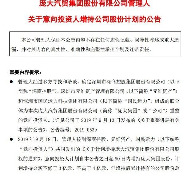 公告稱,本次擬增持股份的目的是為了順利推進龐大集團重組,增強投資者信心,維護中小投資者利益和公司在資本市場的良好形象。本次擬增持的股份類型為境內上市人民幣普通股(a股),增持方式包括但不限于競價、大宗交易、協議轉讓。同時,本次定增股份沒有固定價格和價格區間,本次定增股份計劃不會導致公司控制權轉移。根據9月12日晚間龐大集團的公告,管理人經過多次尋找和談判,確定由深商控股、魏源資產和國運組成的財團為龐大集團重組的意向投資人。同時,控股股東、實際控制人龐慶華等股東及其一致行動人同意轉讓所持有的全部巨額集團股份,被重組投資者有條件接受。