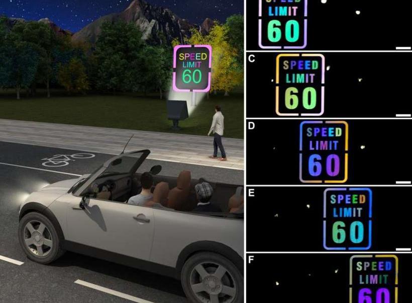(圖片來源:布法羅大學官網)薄膜由聚合物微球組成,這些微球附著在透明膠帶的粘性面上。這種材料的物理結構導致了一個非常有趣的現象:當白光在夜間照射薄膜時,一些人會看到反射回來的單一、穩定的顏色,而另一些人則會看到顏色的變化,這完全取決于觀察者的角度和光源是否在移動。這項研究由中國復旦大學的吳黎敏博士領導。他的團隊開發了這種材料,美國紐約州立大學水牛城分校(也稱為水牛城大學)的光學專家也做出了貢獻,提供了對這種薄膜潛在應用的見解,例如將其用于夜間路標。布法羅大學工程與應用科學學院電子工程副教授喬強·甘博士表示,如果有人在聽音樂,走路或開車時注意力不集中,可以改變顏色的路標可以更好地提醒他們交通狀況。在一組實驗中,研究人員使用這種新的薄膜創建了一個寫有字母和數字的限速標志。隨后,科學家們在附近放置了一盞白光燈來照亮這個標志。當一輛快速行駛的汽車經過時,司機的視角發生變化,路標上的文字顏色似乎在閃爍。在其他測試中,研究人員也將這種材料用于各種標記道路邊緣和指示車道邊界的標記。當車輛靠近時,這種標記會反射車輛前燈的光線,并發出明亮的顏色。從司機的角度來看,標志的顏色似乎沒有變化,但對于一個站在路邊的行人來說,標志上的顏色似乎隨著汽車和大燈的快速駛過而閃爍。