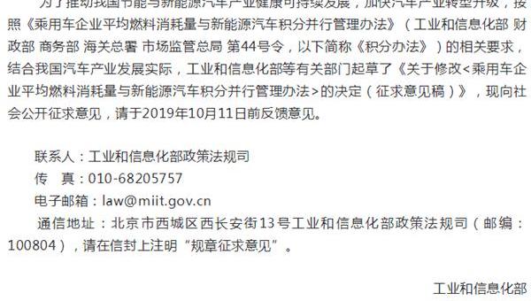 9月11日,工信部發布關于修改《乘用車企業平均燃料消耗量與新能源汽車積分并行管理辦法》(征求意見稿)的決定,反饋截止時間截至10月11日。