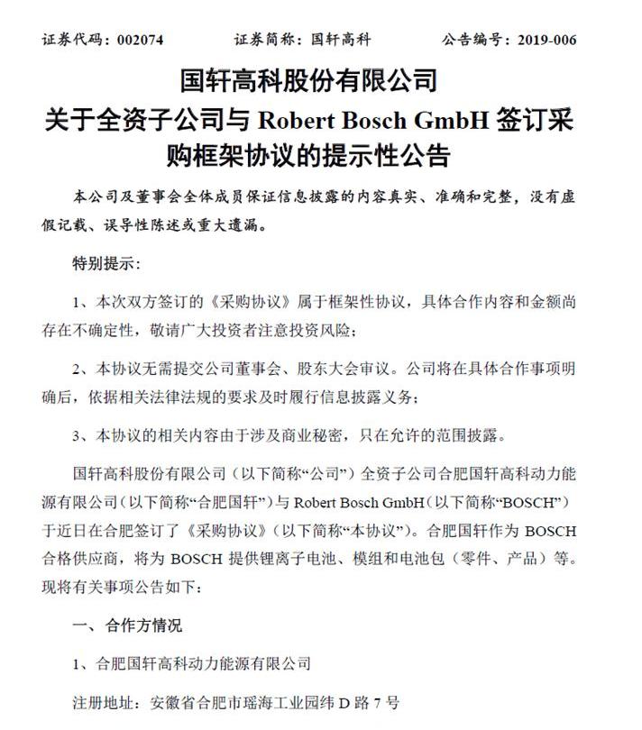 2月14日,國軒高新技術股份有限公司有限公司就全資子公司與國軒高科技股份有限公司有限公司全資子企業羅伯特·博世有限公司(Robert Bosch GmbH)簽署采購框架協議一事發布了一份建議性公告。作為博世的合格供應商,合肥國軒將為博世提供鋰離子電池、模塊和電池組(零部件和產品)。