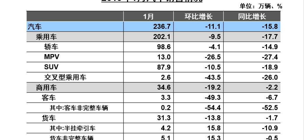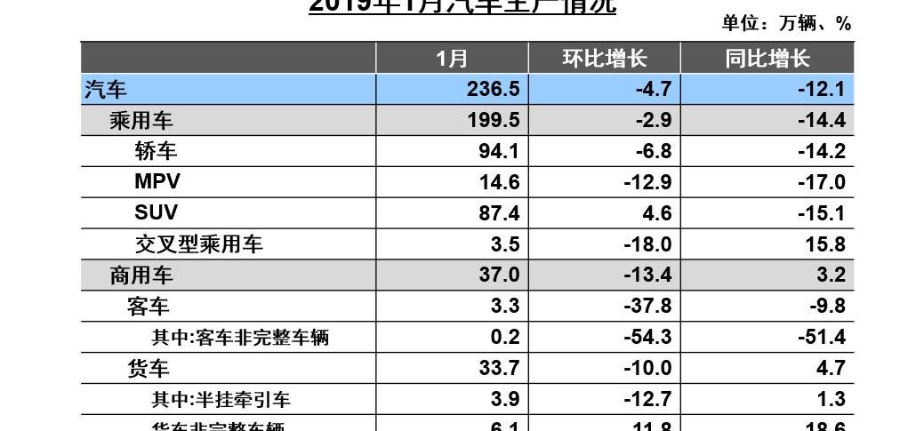 2月18日,中國汽車協會發布了2019年1月汽車產銷數據。從汽車行業整體來看,2019年1月,汽車產銷較上月有所下降,商用車降幅更為明顯;與去年同期相比,汽車產銷快速下滑,乘用車降幅高于行業。具體數據顯示,1月份,汽車產量為236.52萬輛,比上月下降4.71%,比去年同期下降12.05%。銷量為2367300輛,比上月下降11.05%,比去年同期下降15.76%。其中,乘用車產量為19.51萬輛,比上月下降2.90%,比去年同期下降14.39%;銷量為2021100輛,比上月下降9.49%,同比下降17.71%。商用車產量為37.01萬輛,比上月下降13.44%,同比增長3.18%;銷量為34.62萬輛,比上月下降19.18%,同比下降2.18%。