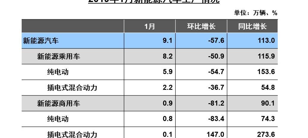 新能源汽車方面,1月份,新能源汽車產銷分別為9.07萬輛和9.57萬輛,分別比去年同期增長1.1倍和1.4倍。其中,純電動汽車產銷分別為6.7萬輛和7.49萬輛,分別比上年同期增長1.4倍和1.8倍;