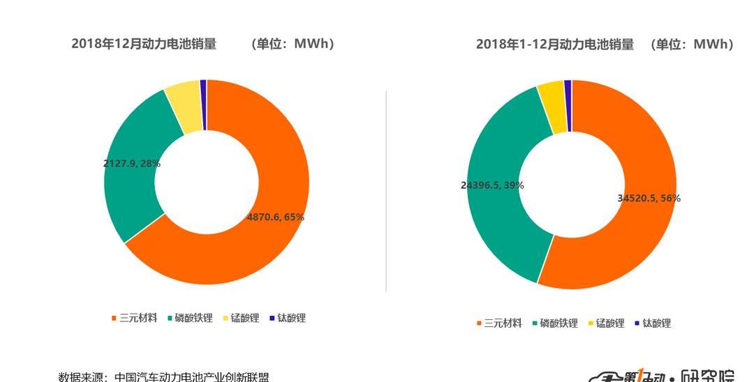 從銷量來看,2018年12月,中國動力電池銷量共計7.5GWh,其中三元電池銷量為4.9GWh,占總銷量的64.8%,約占整車銷量的三分之二;磷酸鐵鋰電池銷量為2.1GWh,占總銷量的28.3%。2018年全年,中國動力電池累計銷量達到62.3GWh,其中三元電池累計銷量達34.5GWh,占總銷量的55.4%;