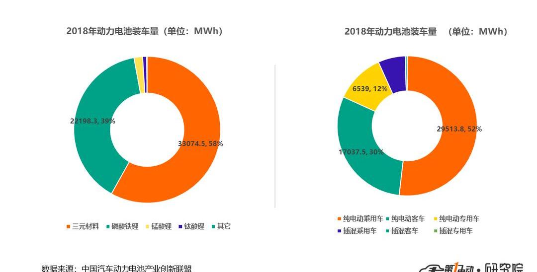 在裝機容量方面,2018年,我國動力電池總裝機容量為56.9GWh,同比增長56.3%。從電池材料來看,三元電池和磷酸鐵鋰電池的年裝機容量分別為33.1GWh和22,2GWh,分別占總裝機的58.1%和39%;從配套車型來看,2018年新能源乘用車和新能源商用車的電池承載能力分別為33.1GWh和23.8GWh,乘用車已成為市場的主要支撐體。