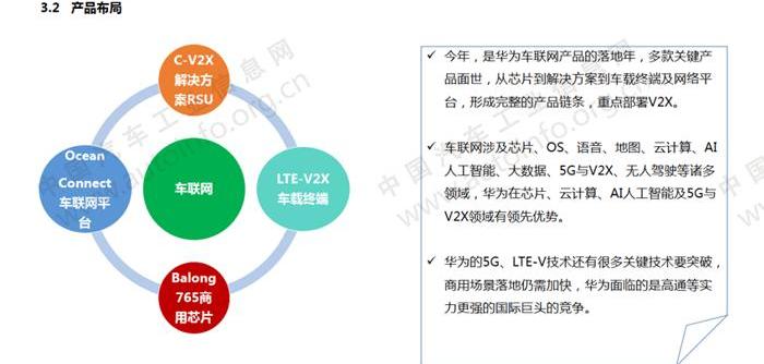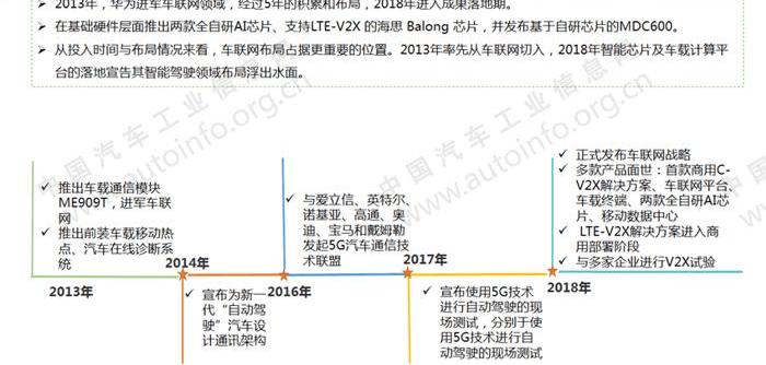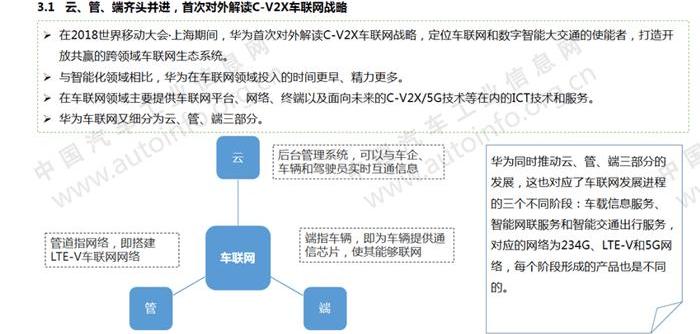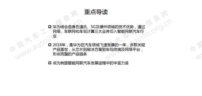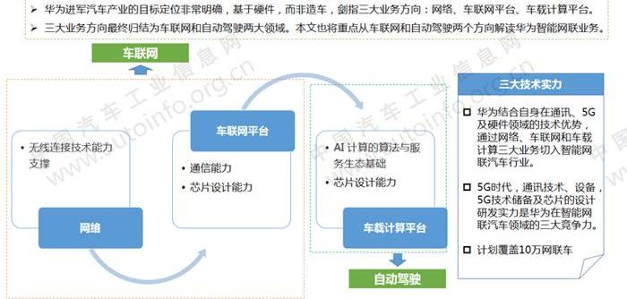 華為結合自身在通信、5G和硬件領域的技術優勢,通過網絡、車聯網和車計算三大服務切入智能網聯汽車行業。2018年,華為在汽車領域發展迅速,成為中國智能網聯汽車發展的重要力量。