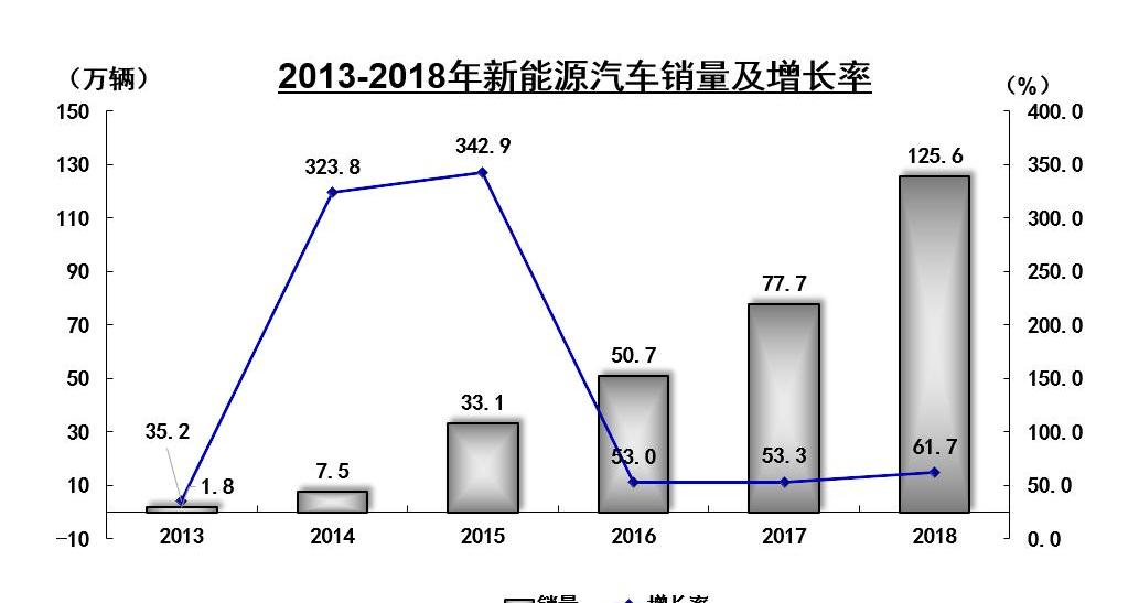 2018年,新能源汽車產銷分別為127萬輛和125.6萬輛,分別比上年同期增長59.9%和61.7%。其中,純電動汽車產銷分別為98.6萬輛和98.4萬輛,分別比上年同期增長47.9%和50.8%。插電式混合動力汽車產銷分別為28.3萬輛和27.1萬輛,分別比去年同期增長122%和118%。燃料電池汽車的生產和銷售全部完成1527輛。