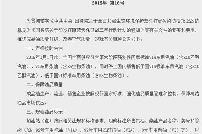 同時,該文件要求加油站(點)按照相關法律和標準的要求,明確標明所售汽柴油產品(如:92號車用汽油(VIA)、92號車用車用乙醇汽油(VIA)、0號車用柴油(VI)等)的名稱、品牌和等級,以方便消費者選擇,政府監督和社會監督。此外,該文件還對確保油品質量和加強有效監管作出了指示。值得注意的是,該文件由國家發展改革委、部、生態環境部、商務部、國有資產監督管理委員會等七部委聯合簽署,國家市場監督管理總局和國家能源局。2018年6月13日,中華人民共和國國務院總理李克強主持召開國務院常務會議,部署實施保衛藍天、持續改善空氣質量三年行動計劃。會議明確指出,自2019年1月1日起,全國將全面供應符合國六標準的車用汽柴油。七部委發布的這份聯合文件也是對國務院常務委員會會議的回應。