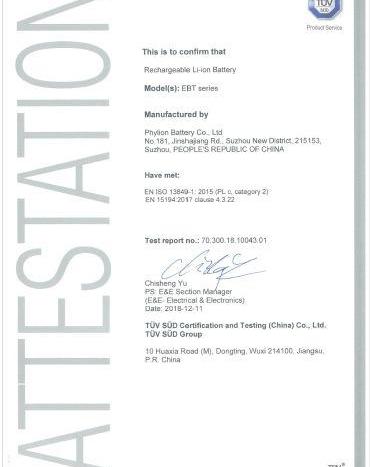 2018年12月11日,興恒電源有限公司獲得了TUV SUD發布的符合EN ISO 13849-1:2015(PL C,2類)和EN15194:2017第4.3.22條相關要求的EBT系列鋰電池的批準報告。這標志著星恒成為國內首家基于軟硬件解決方案相結合的輕型鋰電池企業,并通過符合EPAC標準的TUV SUD批準批量應用。EN15194:2017標準是電動自行車的新標準。它的發布對電動自行車和電動系統的可靠性和安全性提出了更高的要求。