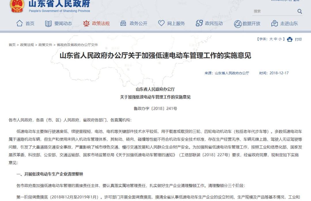 12月16日,山東省人民政府辦公廳正式發文,發布了《關于加強低速電動車管理的實施意見》(以下簡稱《實施意見》)。對于在用車輛,《實施意見》提出,制定在用車輛處置辦法,設定三年過渡期,鼓勵通過置換、回購、報廢等方式淘汰在用低速電動車。同時指出,在國家標準發布三個月后,該省禁止銷售不符合國家標準要求的低速電動汽車。《實施意見》指出,2019年4月至2019年底為清理整頓階段。《四輪低速電動汽車技術條件》國家標準和低速電動汽車規范管理相關政策發布后,根據明確的相關標準、政策和措施,將制定并實施本市清理整頓專項計劃,依法采取綜合措施清理不合格生產企業。嚴禁未經許可和未經強制性產品認證生產、銷售低速電動汽車。可以判斷,業界翹首以盼的新國標要到2020年之后才會出臺。