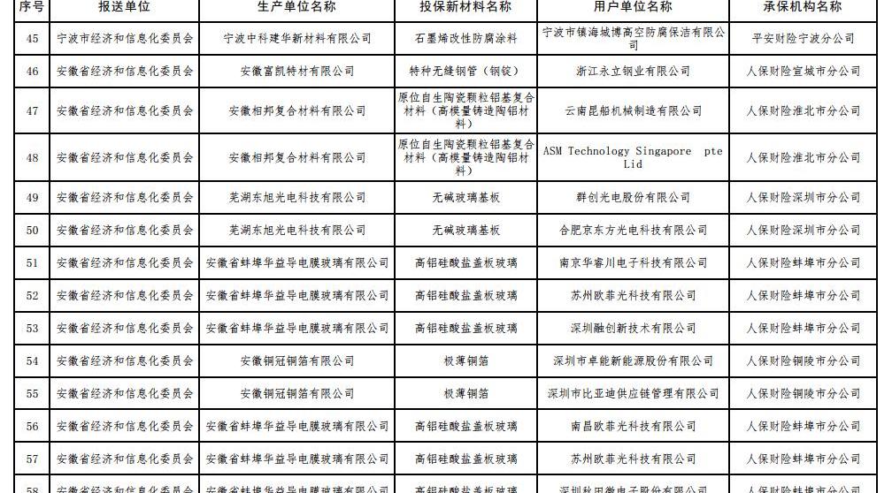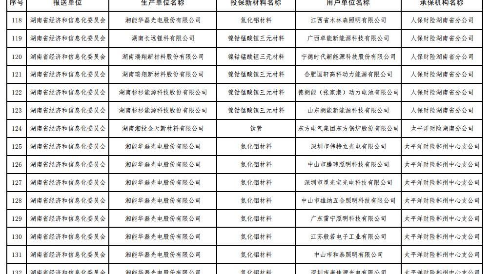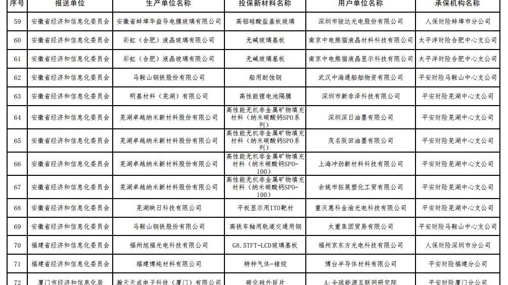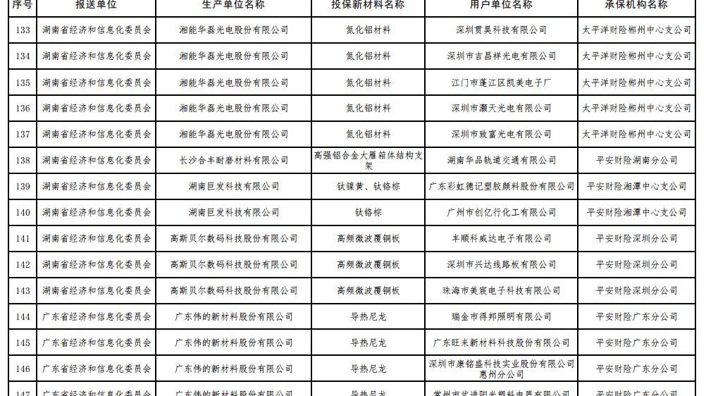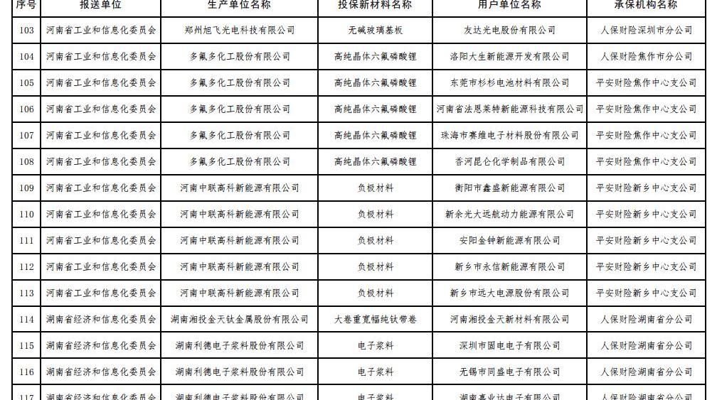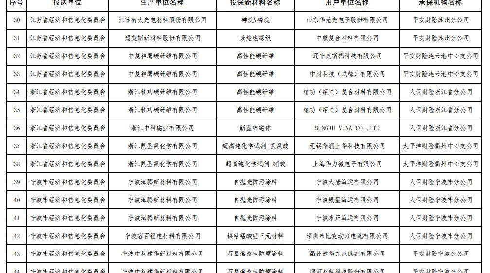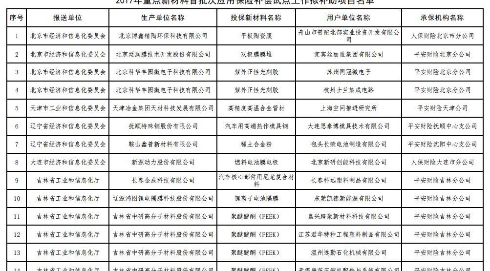 6 7月17日,工信部根據《工信部通知》公布了2017年第一批重點新材料保險補償機制試點工作擬補貼項目,財政部、中國保監會《關于啟動第一批重點新材料保險補償機制試點工作的通知》(工信部聯原〔2017〕222號)。投保的新材料涉及鎳鈷錳酸鋰三元材料、碳纖維復合芯導體、,高性能鋰電池隔膜、電子粘合劑硅樹脂材料、負極材料、電子漿料、高純度結晶六氟磷酸鋰、碳化硅外延片、高性能碳纖維等,共有244家提交生產單位。以下是2017年首批重點新材料保險賠付試點工作擬補貼項目名單: