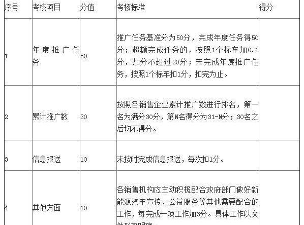 未完成年度推廣任務的,按一輛標準車扣1分,直至扣完為止。七、累計晉升分數為30分。按各銷售企業累計促銷數量排名,第一名得30分,第N名得31-N分;30分之后,沒有得分。八、提交資料得10分。各銷售企業要積極開展新能源汽車促銷活動,每月報送新能源汽車銷售情況。未按時提交的,每次扣1分。九、其他方面得分10分。各銷售機構要積極配合政府部門做好新能源汽車推廣、公益服務等需要配合的工作,每完成一項工作加3分。具體工作由文件情況明確定義。十、經信委在每年第一季度對銷售企業進行積分考核,并通過經信委網站等方式公布考核結果。新能源汽車銷售企業綜合評價標準