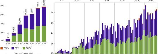 根據零排放汽車聯盟的銷售數據,截至2017年10月底,加州共有176681輛純電動汽車和燃料電池汽車。加上插電式混合動力汽車,零排放汽車總數達到337483輛。2012年,杰里·布朗發布了B-16-12號行政命令,旨在到2025年使加州的零排放汽車數量達到150萬輛。2013年,杰里·布朗發布了“零排放汽車行動計劃”,明確指出了加州政府的具體行動措施。2016年10月,杰瑞·布朗零排放汽車跨部門工作組更新了《零排放汽車行動計劃》,更新后的版本還涵蓋了中型和重型車輛以及公共交通和貨運車輛的零排放技術。據外媒報道,加利福尼亞州州長杰里·布朗在第16次國情咨文中指出,希望到2030年,加州的零排放汽車數量達到500萬輛。零排放汽車包括氫燃料電池汽車(FCEV)和插電式電動汽車(PEV),后者包括純電動汽車和插電混合動力汽車。