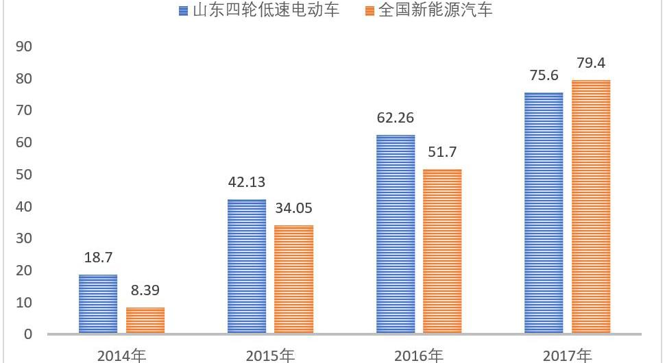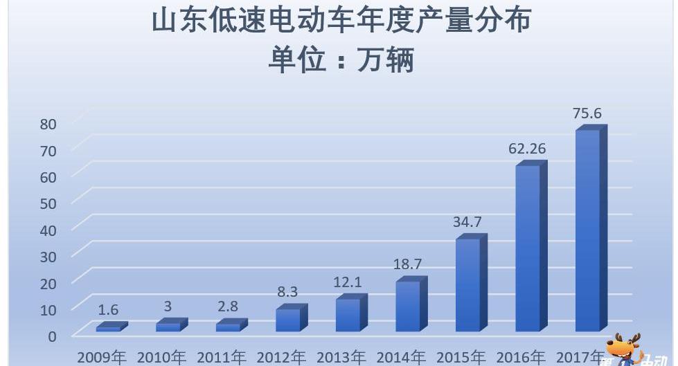 在2017年12月的第八屆全球新能源汽車大會上,山東省汽車工程學會理事長魏學勤預測,2017年山東低速電動汽車年產量將在70萬輛左右,基本接近實際:根據山東省汽車工業協會統計,2017年1-12月,山東省低速電動車累計產量為75.6萬輛,較2016年同期的62.3萬輛增長21.4%。