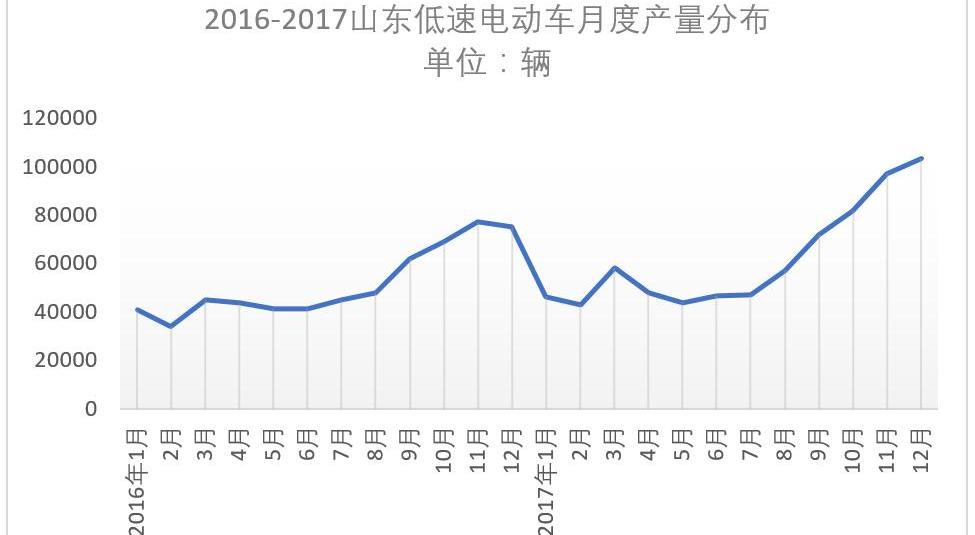 數據來源:山東省汽車工業協會成聯注:A00純電動汽車和純電動汽車的總銷量是山東小型電動汽車的產量。不過,2018年新能源補貼調整計劃或一季度發布的消息,對低速電動車行業來說無疑是個好消息。就上期披露的調整方案而言,A00純電動乘用車補貼大幅下降,這意味著2018年A00電動車的市場終端價格可能大幅上漲,2017年將收獲大量低速電動車市場訂單。就月度產量水平而言,山東低速電動車的最高月度產量仍在12月。據山東省汽車工業協會統計,12月山東生產低速電動車103298輛,比2016年同期增長27.1%,比11月增長6.4%。值得一提的是,這也是低速電動車月產量首次躍升至10萬輛的水平。2017年第四季度的月度生產和銷售連續創下新高。