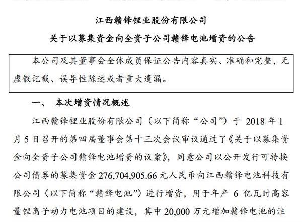 1月6日,贛峰鋰業(002460)宣布,公司計劃向子公司江西贛峰電池科技有限公司(以下簡稱“贛峰蓄電池”)增資,募集資金約2.77億元,用于建設年產6億瓦時的大容量鋰離子動力電池項目。其中,2億元將增加贛鋒電池的注冊資本,其余將作為資本公積。