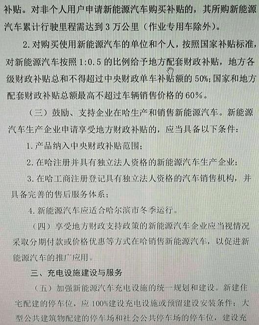 《關于促進哈爾濱市新能源汽車推廣應用和產業發展的若干政策規定》(新修訂)于12月21日正式頒布實施。2017年以來,政府機構、金融機構、事業單位公務用車、公交車、環衛車等新能源汽車每年新增或更新的比例不低于30%。新能源汽車在市區不受尾號限制。根據《政策規定》,哈爾濱市未來新建住宅的停車位應100%建成充電設施或預留建筑安裝條件;具有充電設施或預留建安條件的大型公共建筑和社會公共停車場的停車位比例不低于10%。鼓勵和支持社會資本參與充電設施的建設和運營。有關部門要為新能源汽車的車輛登記、上牌、年檢等服務開辟“綠色通道”,在機動車駕駛證上標注新能源汽車。在城市地區行駛的新能源汽車不受車輛號牌和尾號限制;交管部門核發牌照的純電動輕型和微型封閉式貨運車輛不受貨運車輛限制;持有交管部門核發的號牌的中重型新能源貨運車輛,可在早晚高峰時段及市區11條道路(臨時)外通行。國家和地方政府按照1:0.5的比例給予補貼。在購車補貼方面,新《政策規定》規定,個人和企業按照國家補貼標準,按1:0.5的比例給予地方配套財政補貼,低于原規定。以一輛23萬元的純電動汽車為例。國家補貼標準為4.4萬元。按照原標準,當地政府將再補貼4.4萬元,購車者將獲得8.8萬元的補貼。按照新的國家和地方比例1:0.5,地方補貼2.2萬元,購車者共獲得6.6萬元補貼。企業獲得500萬元的國家級研究中心資助。根據《政策規定》,如果受監管的具有獨立法人資格的企業設立的研發機構被批準為市級和國家級工程技術研究中心、工程研究中心(工程實驗室)和企業技術中心,最高的研發平臺建設費用將分別給予100萬元和500萬元;對獲批為省級工程技術研究中心并獲得資金支持的,給予最高150萬元的研發平臺建設補貼。對學校(所)獨立或聯合社會力量設立產業技術研究院,為我市企業提供技術支持和技術咨詢服務的,經審批,最高給予100萬元啟動資金支持。列入國家推廣目錄的車型最高獎為100萬。對在哈薩克斯坦注冊的獨立法人企業,列入工信部新能源汽車推廣應用推薦車型目錄的乘用車和客車車型實現產業化的,每種車型最高獎勵100萬元;如果是工業和信息化部列入新能源汽車推廣應用推薦車型目錄并形成產業化的專用車型,每款車型最高獎勵60萬元。由于國家補貼資金由預分配制改為清算制,要求非個人用戶在累計里程達到3萬公里后,購買除專用車以外的新能源汽車運營。因此,生產企業獲得國家補貼資金的期限大大延長。為緩解其資金壓力,哈爾濱市規定,當地生產企業獲得生產銷售訂單后,按實際支付利息的50%給予貼息,最高1000萬元;