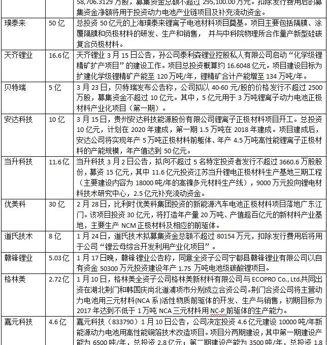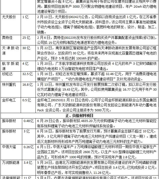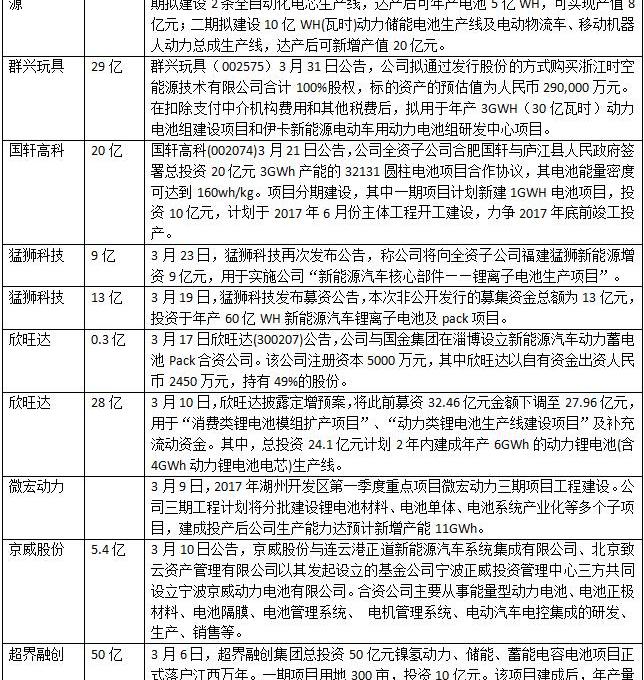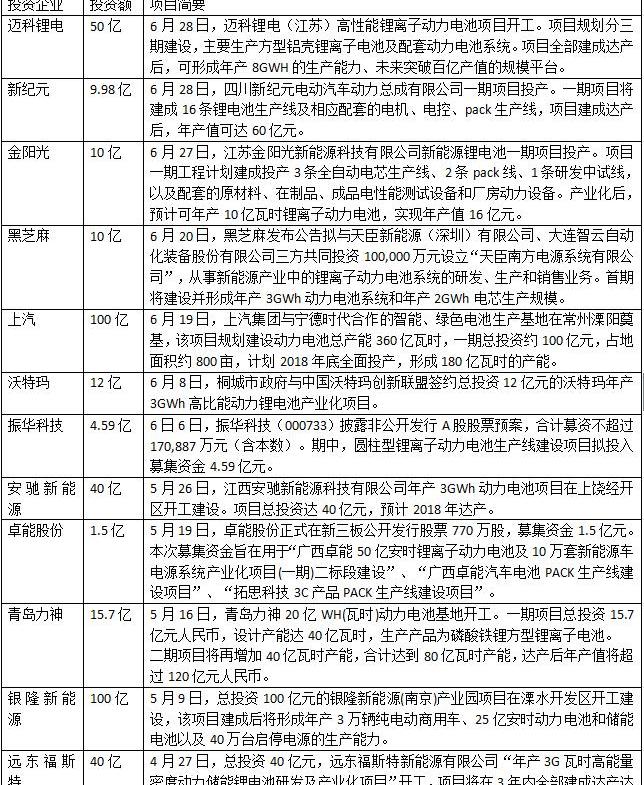近年來,隨著新能源汽車市場的火爆,動力電池作為新能源汽車的“心臟”,不斷受到資本市場的追捧。從2017年上市公司的公告和公開報告來看,第一電氣網絡并未完全統計2017年上半年在動力電池領域的投資情況。包括統計在內,52項投資占項目總投資919.96億元。其中,動力鋰電池項目30個,投資676.27億元;有16個陽極和陰極材料項目,投資183.19元;電解質和隔膜項目共6個,投資60.5億元。根據計劃,到2020年,新能源汽車年產銷將達到200萬輛。可以預見,未來對動力電池的需求仍然很大。有業內人士預測,2017年中國對動力電池的需求將增至31GWh,到2020年將達到125Gwh。未來,資本市場將進一步加快對動力電池的投資。