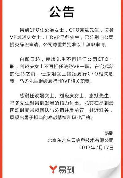 7月17日,易到官方微博發布消息稱,易到CFO任汝先、CTO袁斌、法務副總裁劉曉慶、人力資源副總裁馬東向公司提交了辭職申請,易到尊重并批準了上述辭職申請。根據公告,在完成新任命之前,任汝先繼續履行首席財務官相關職責,馬東繼續履行人力資源副總裁相關職責。