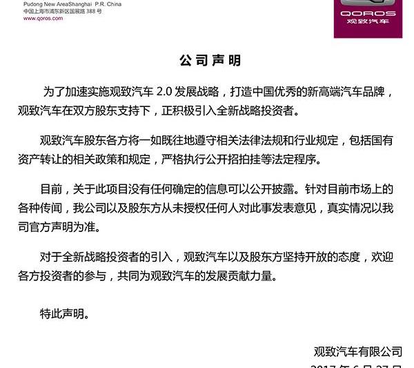 6月27日,觀致汽車回應了此前的一系列收購傳聞。聲明稱:它確實在積極引入新的戰略投資者,但目前“沒有確切的消息可以公開披露”。