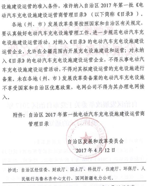 4月24日,新疆維吾爾自治區發展和改革委員會公布了2017年自治區首批電動汽車充電設施建設運營商名單。新疆國和電力科技有限公司、哈密國投通惠新能源汽車運營有限公司、有限公司、新疆火炬燃氣有限公司、新疆通德能源有限公司、有限公司、新疆匯源電力有限公司、有限公司和涇河中亞新能源科技有限公司等七家企業可以在新疆建設和運營充電設施。