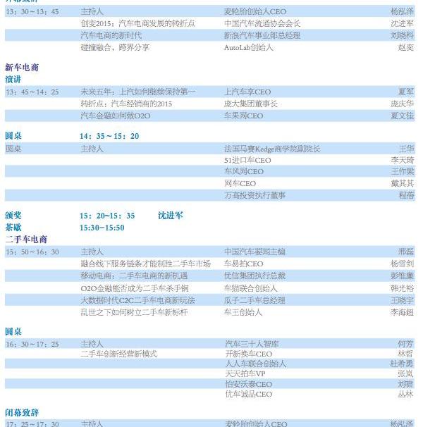 整個大會包括開幕致辭、演講、圓桌會議、頒獎和閉幕,以及媒體對嘉賓的獨家采訪。嘉賓們將從新車電商和二手車電商兩大方向分享演講,以及以“中國汽車電商迎來新的轉折點”和“二手車創新管理模式”為主題的兩場圓桌討論。眾多重量級嘉賓和其他行業人士將帶來精彩的分享和對話。