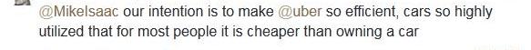 卡蘭尼克在推特上回復道:“只要買車比使用優步便宜,我們就不會漲價。”。