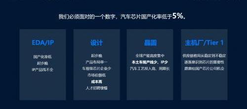 圖片:梁永杰發表主題演講任重道遠:呼吁全產業鏈全面合作,共建汽車芯片生態供應鏈。報告提到了一個嚴峻的數字:中國汽車芯片的國產化率不到5%,從上游的EDA/IP服務提供商和設計制造商到晶圓制造,再到下游的原始設備制造商和TIER 1應用,每個環節都存在一些問題。我們必須深入了解自己的問題,才能找到相應的決策。