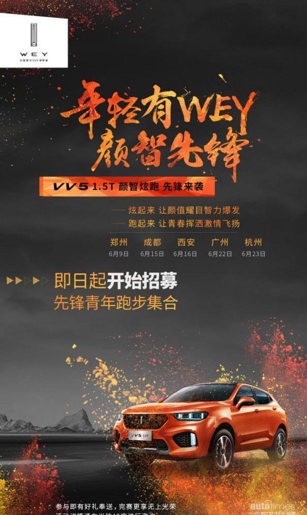 當流行于年輕人生活圈的熒光夜跑遇上年輕、WEY顏智,會點燃怎樣的火花?6月9日,“VV5 1.5T嚴之選潤-鄭州火車站”將登陸鄭州彩虹盒藝術區,帶來一場“色彩人生”的炫目秀。您將見證強大的新款VV5 1.5T的耀眼亮相,通過快閃舞、超靈敏音頻和酷炫夜跑等身臨其境的體驗,釋放年輕活力,體驗先鋒姿態。即日起,前往當地WEY品牌4S店或掃描文末二維碼關注WEY SUV官方微博賬號,即可參加顏智炫跑活動。與更多WEY年輕人一起四處奔跑,盡情享受。